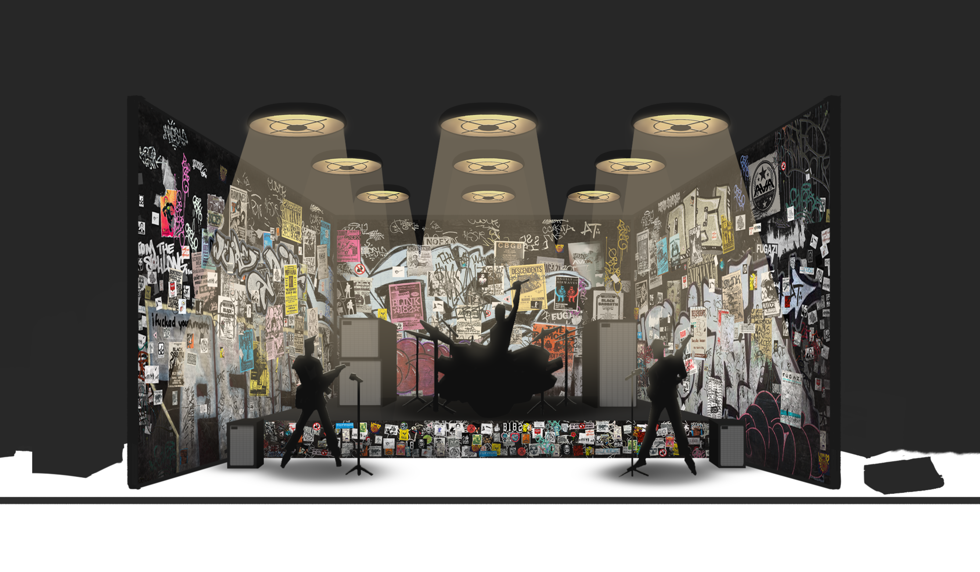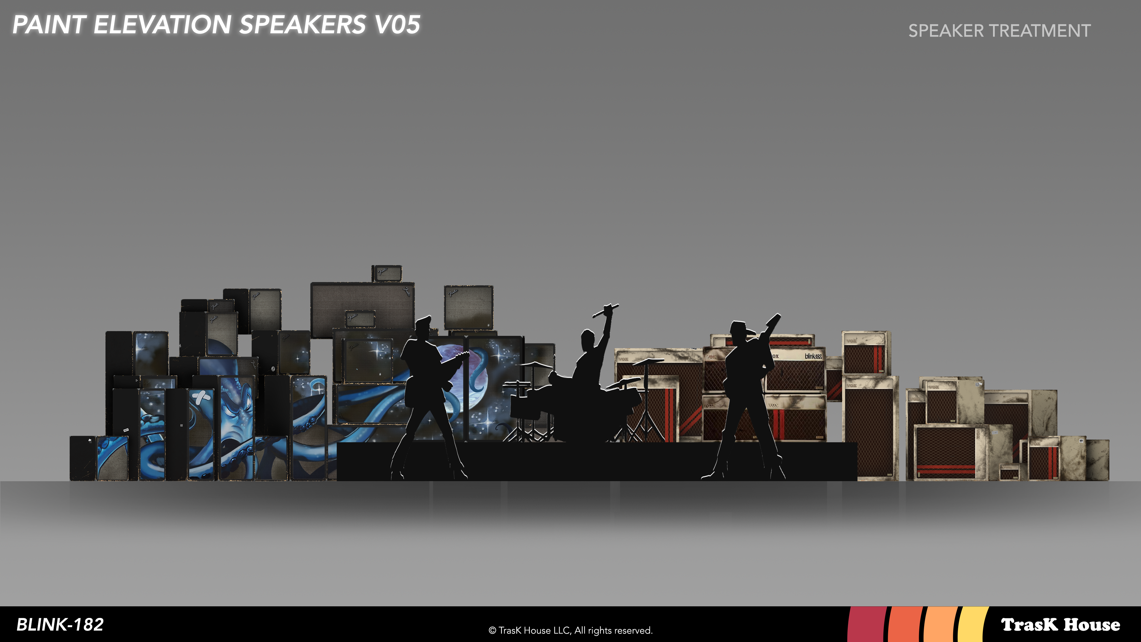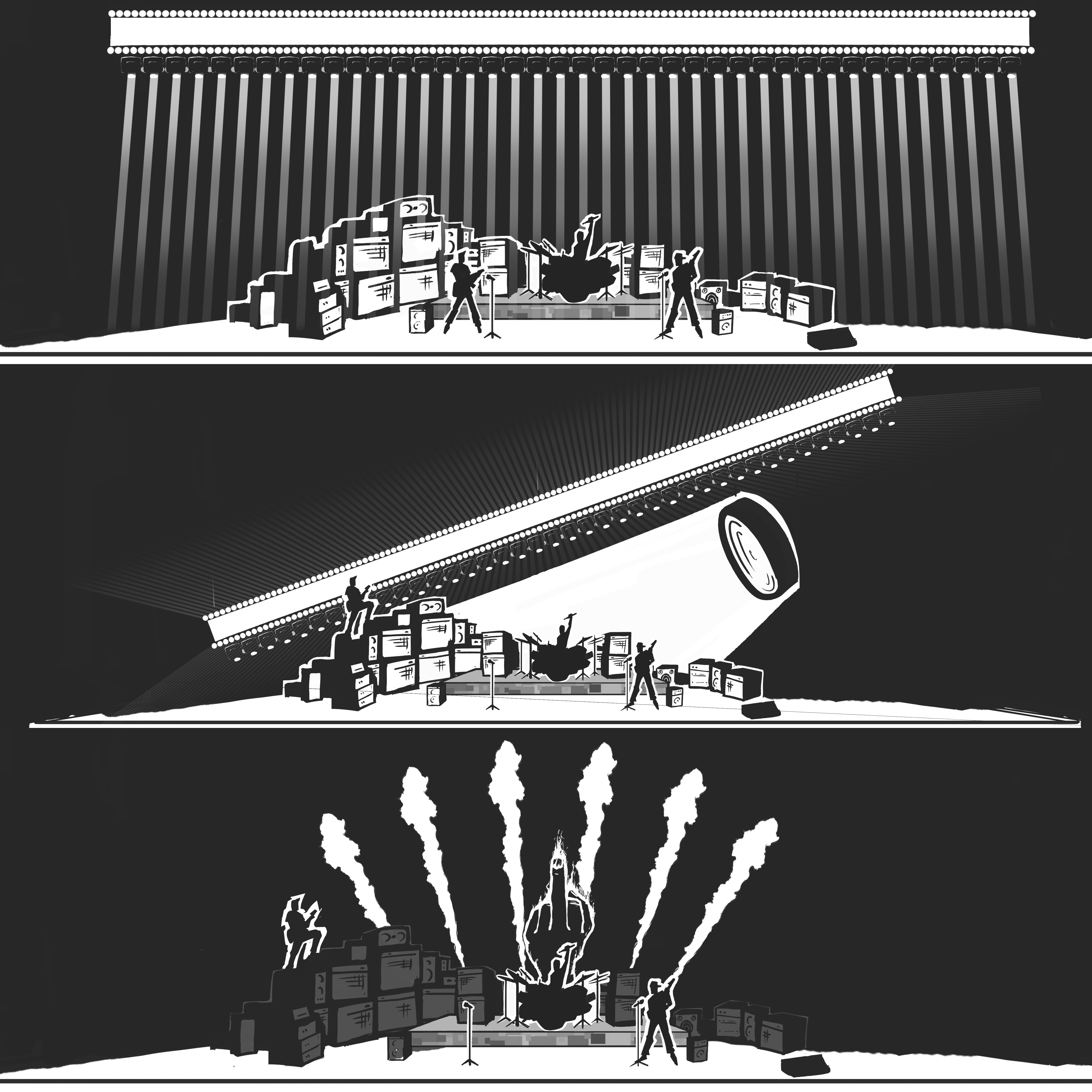 Stage concept sketches, texture renderings, prop design, and show visuals